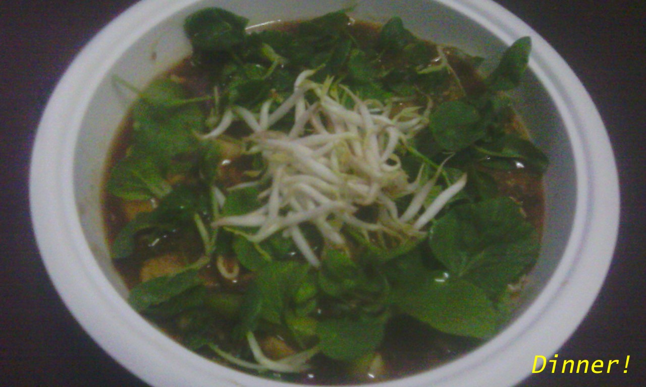 My Dad bought me lunch today, so I didn't cook my lunch. I always skip breakfast because I eat too much, but lunch was rather late today. It didn't get to me until 20 minutes before voice training. Which is cool. It was rice and chicken, with a side of curry, which my Dad got at one of his favorite restaurants in Arau, the royal town about 12km away. I usually have noodles for lunch, but today I had it for dinner. I had to use up that fish head, so I made soup with it. The broth was surprisingly dark but tasty, and I gave the kittens the head as a snack. Full of vegetables today, from my garden.